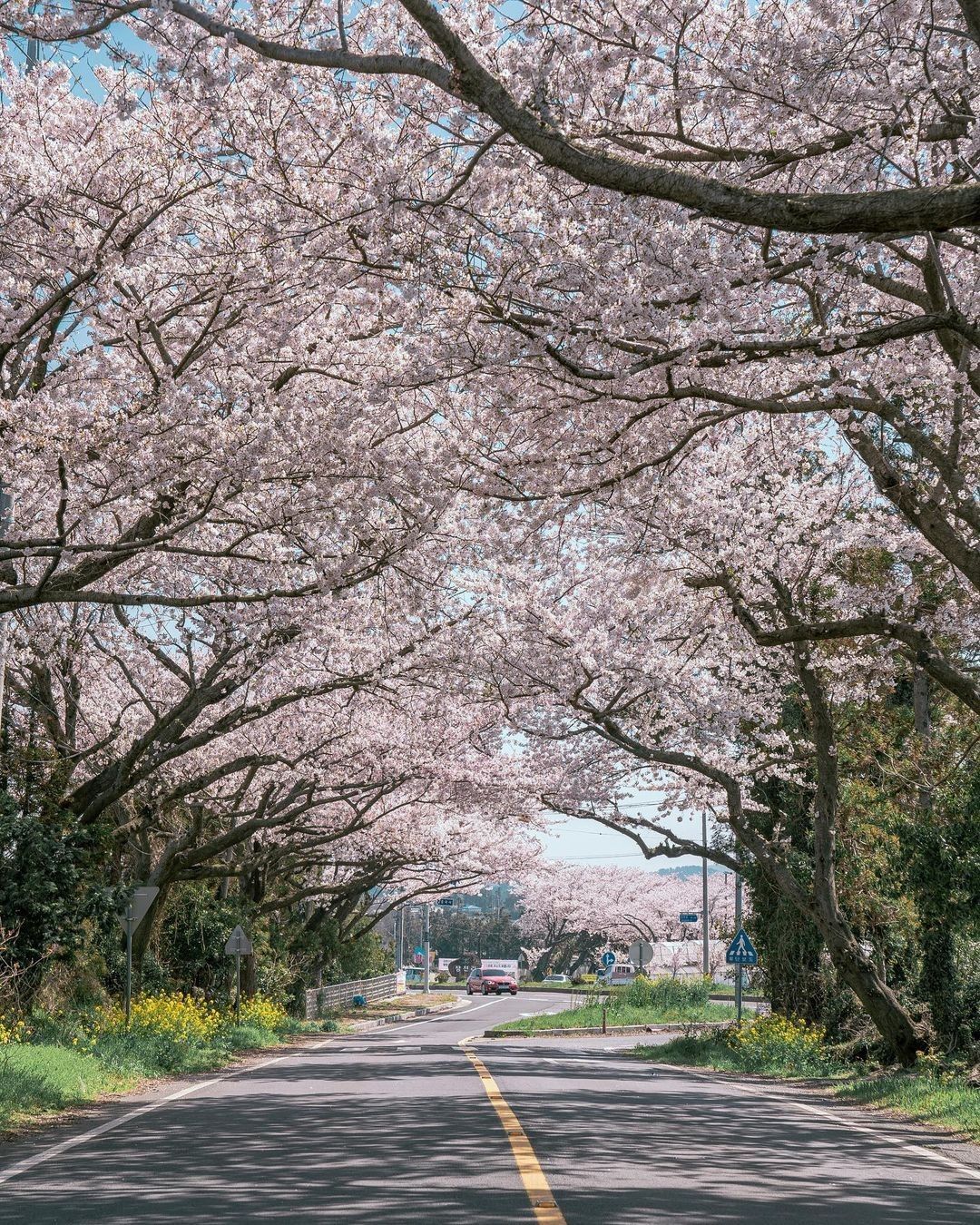 제주 시내의 대표적인 벚꽃 명소는 단연 전농로입니다. 좁은 2차선 도로 양옆에는 오래된 벚나무들이 줄지어 서 있고, 양옆에는 나뭇가지들이 풍성해 벚꽃이 터널을 이루고 있습니다.